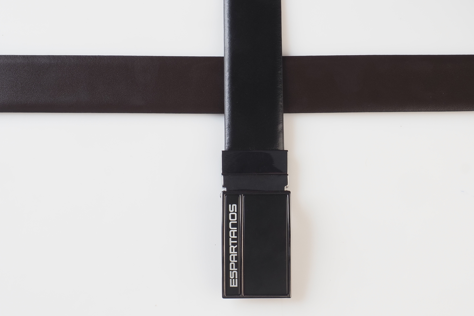 Cinturón de color negro fabricado en piel natural. Hebilla metálica de placa rectangular en color rutenio oscuro con sistema de canalera. La parte superior de la hebilla incorpora la firma ESPARTANOS en contraste. Es un modelo con un perfil marcadamente moderno. Hecho en España.