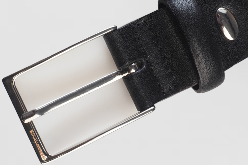 Cinturón de color negro fabricado en piel natural. La hebilla es metálica de color níquel e incorpora la firma ESPARTANOS en el perfil superior. Rematado con una presilla de piel del mismo color. Es un modelo de línea elegante y clásica. Hecho en España.
