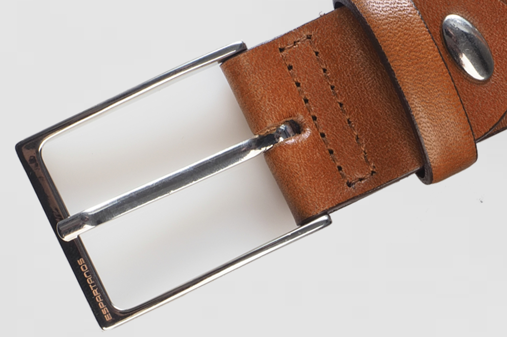 Cinturón de color marrón fabricado en piel natural. La hebilla es metálica de color níquel e incorpora la firma ESPARTANOS en el perfil superior. Rematado con una presilla de piel del mismo color. Es un modelo de línea elegante y clásica. Hecho en España.