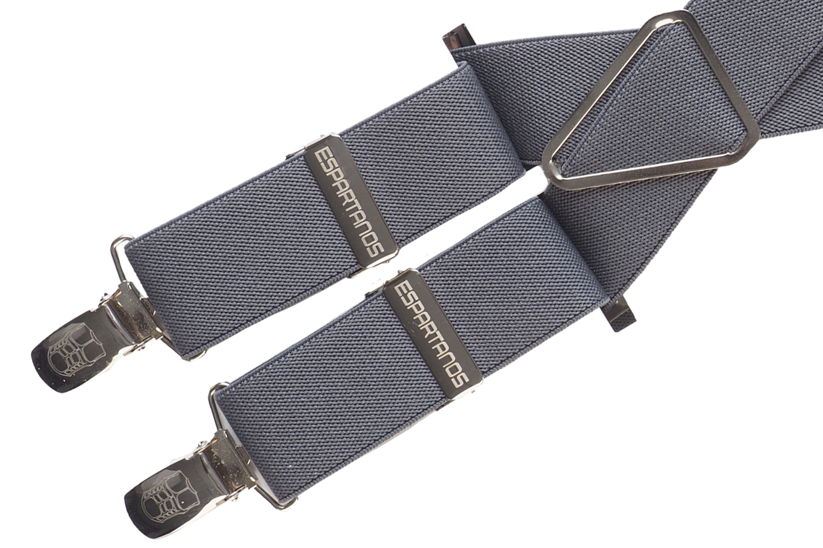 Tirantes elásticos lisos en color gris. Terminado con herrajes de color níquel y rematados con el logotipo de la armadura representativa de Espartanos Traditio en cada una de las pinzas de sujeción. Destacan las presillas grabadas con la marca ESPARTANOS dando un toque de distinción a estos tirantes fabricados en España.